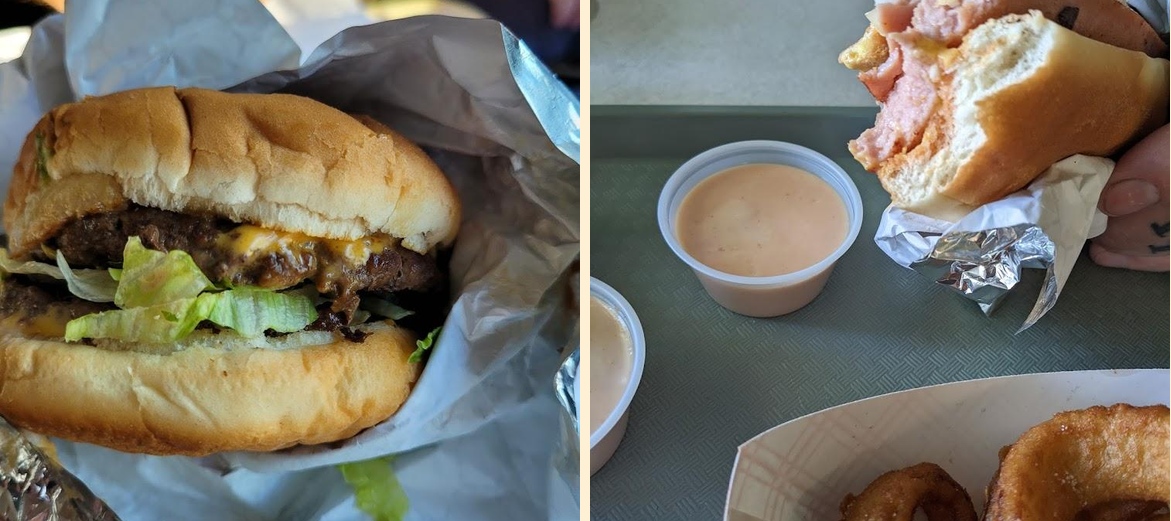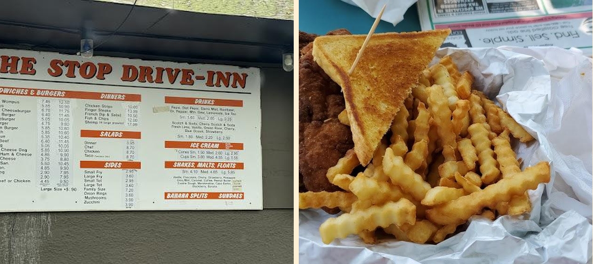 The Stop Drive-In serves a variety of American dishes. Enjoy burgers, salads, ice cream, and various sides. Don't miss their famous Jumbo Cheeseburger and delicious desserts.